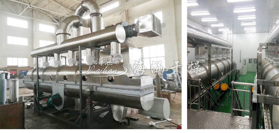 2、该生产线的核心部分:干燥系统。采用分段加热的方式,预干燥段采用高压低风量风机,使较湿的鸡精颗粒能完全流化;干燥段采用低压高风量的风机,单位时间内带走水份多,干燥均匀;冷却段采用高风量风机,能迅速带走热量,降低产品温度,既达到水分控制的要求,又方便后续包装工艺。